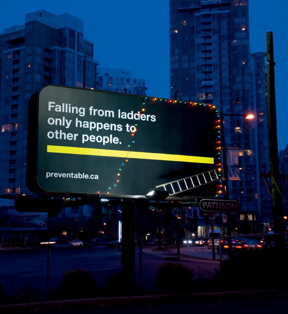 Displayed at high-traffic locations in downtown Vancouver and on Vancouver Island, the billboard showed a string of lights left hanging loose, giving the impression that someone has fallen off the ladder.